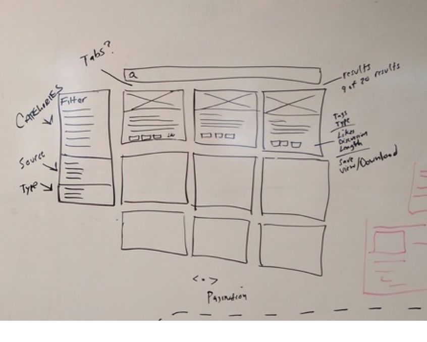 The notes included a variety of things we’d like to do with search, many of which were influenced by what we had sketched on the whiteboard, such as the ability to filter results by a variety of attributes, the ability to change the order of the displayed results, the ability to like certain items, and save items, and pagination for the display.
